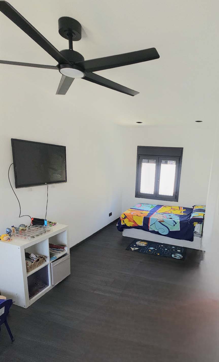 En la planta superior, encontrarás tres acogedoras habitaciones. El guardarropa es tan espacioso que se ha convertido en un elegante vestidor. La suite principal cuenta con un baño privado, y hay un segundo baño con una cómoda bañera para el resto de la familia. Para tu confort, la casa está equipada con aire acondicionado, tanto frío como caliente, asegurando un ambiente perfecto durante todo el año.