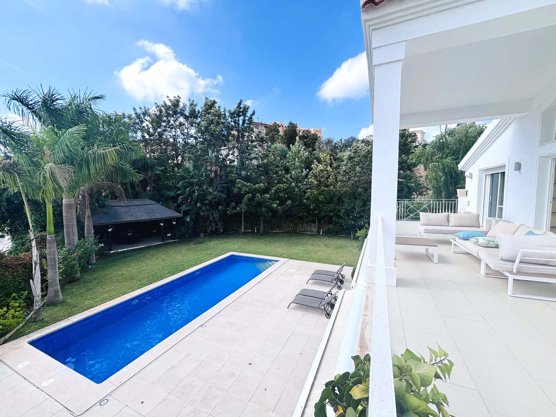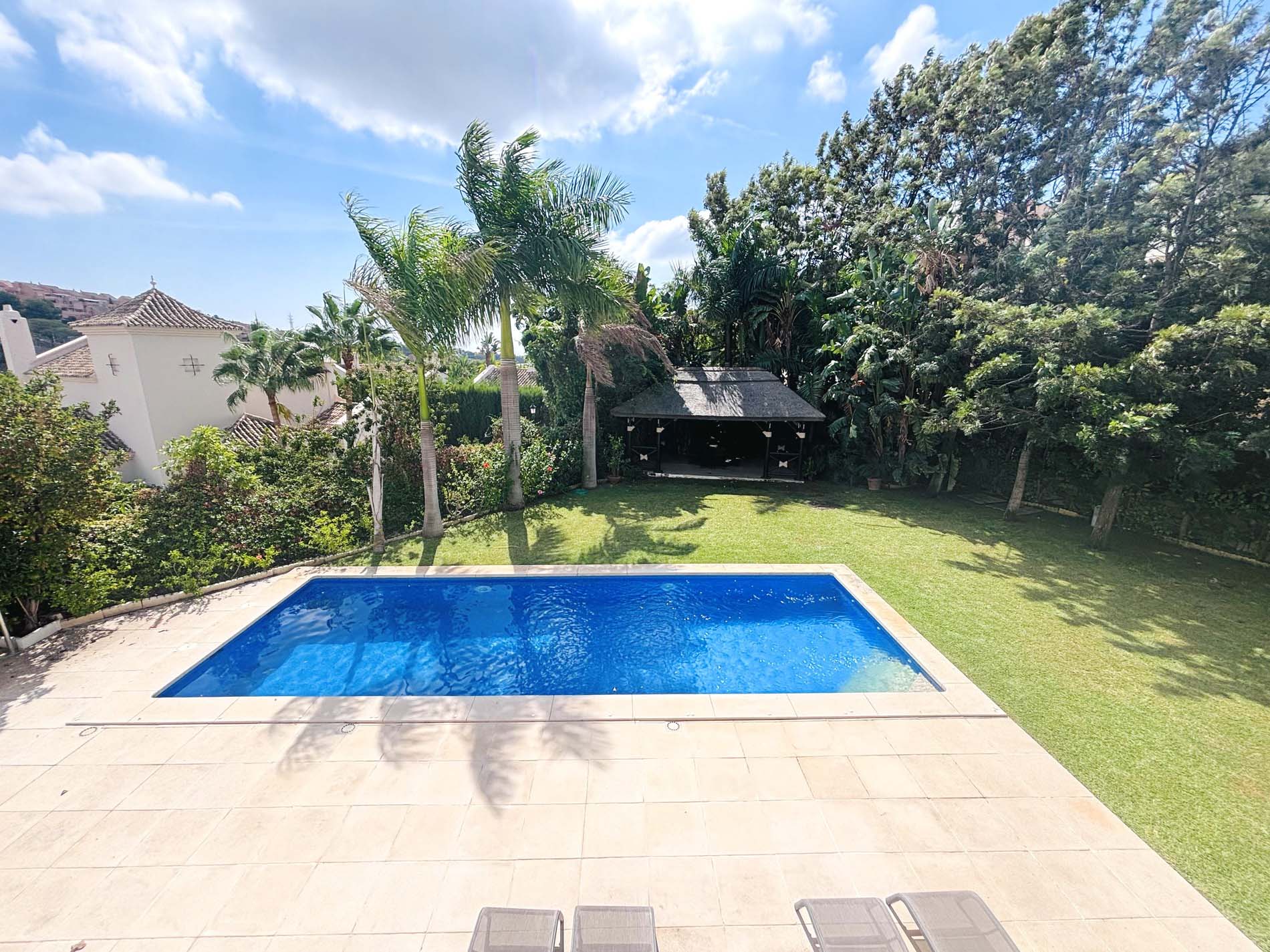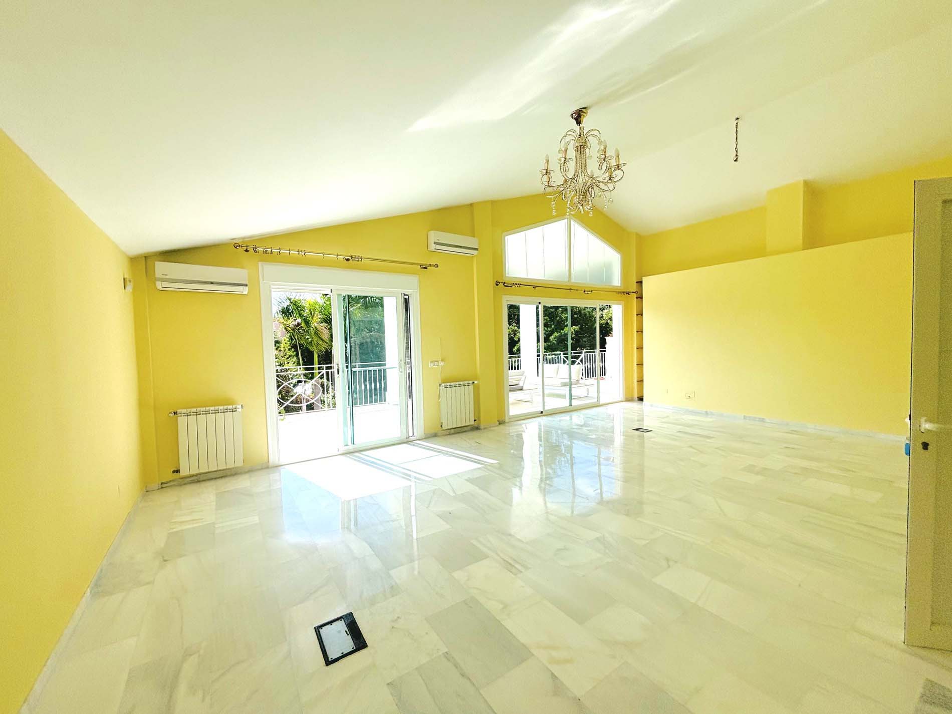 Villa de lujo sin amueblar de 5 dormitorios con piscina y amplio patio en alquiler a largo plazo en Elviria, Marbella Este.