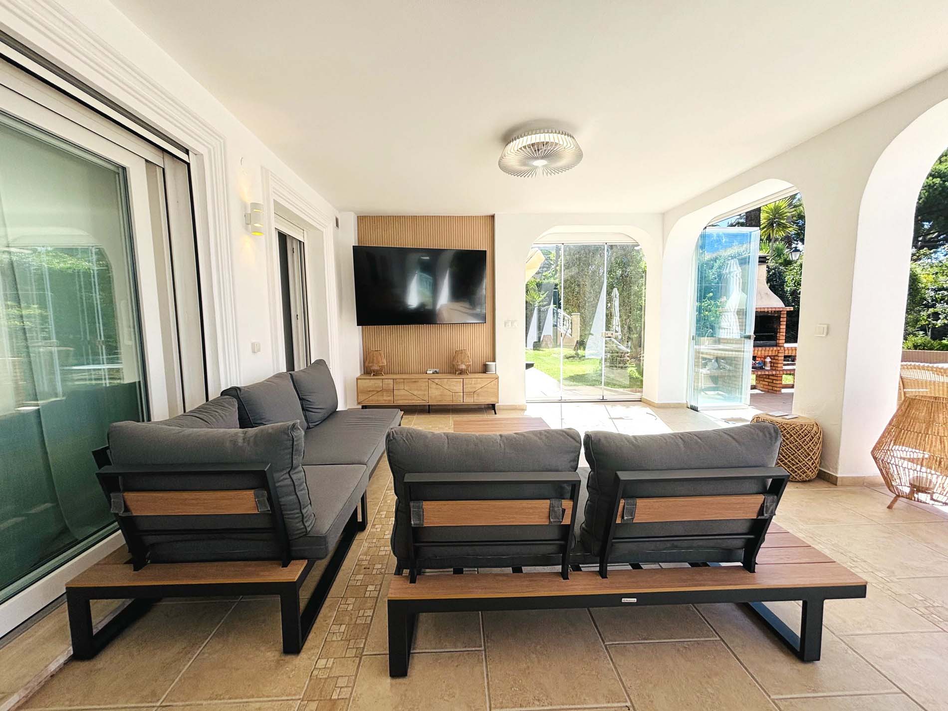 Planta Baja: Un segundo salón con acceso directo a la terraza, que conduce al jacuzzi, jardín y piscina climatizada. El espacio al aire libre incluye una cocina de verano bien equipada con electrodomésticos de calidad profesional, perfecta para cenar y entretenerse al aire libre.
