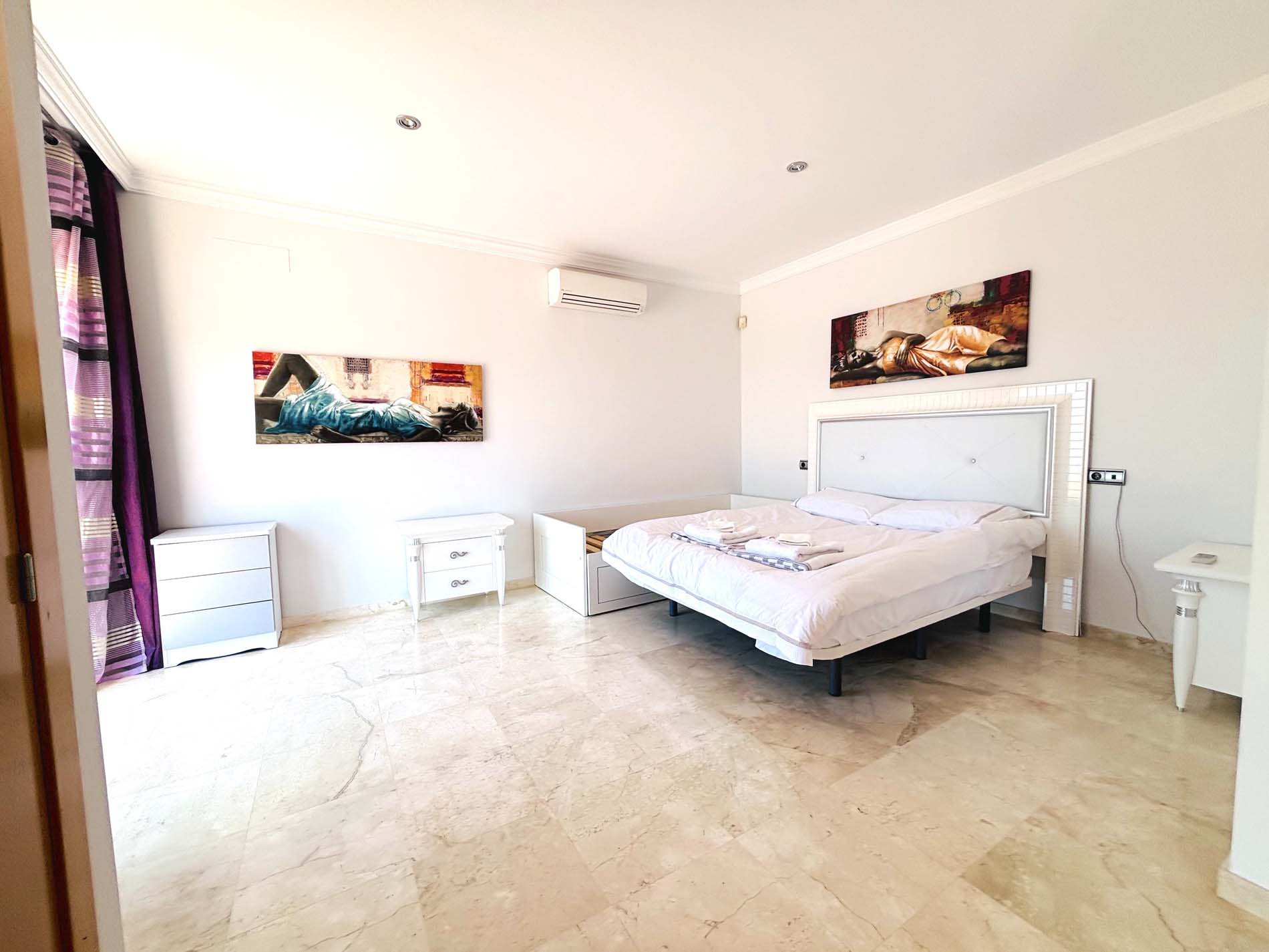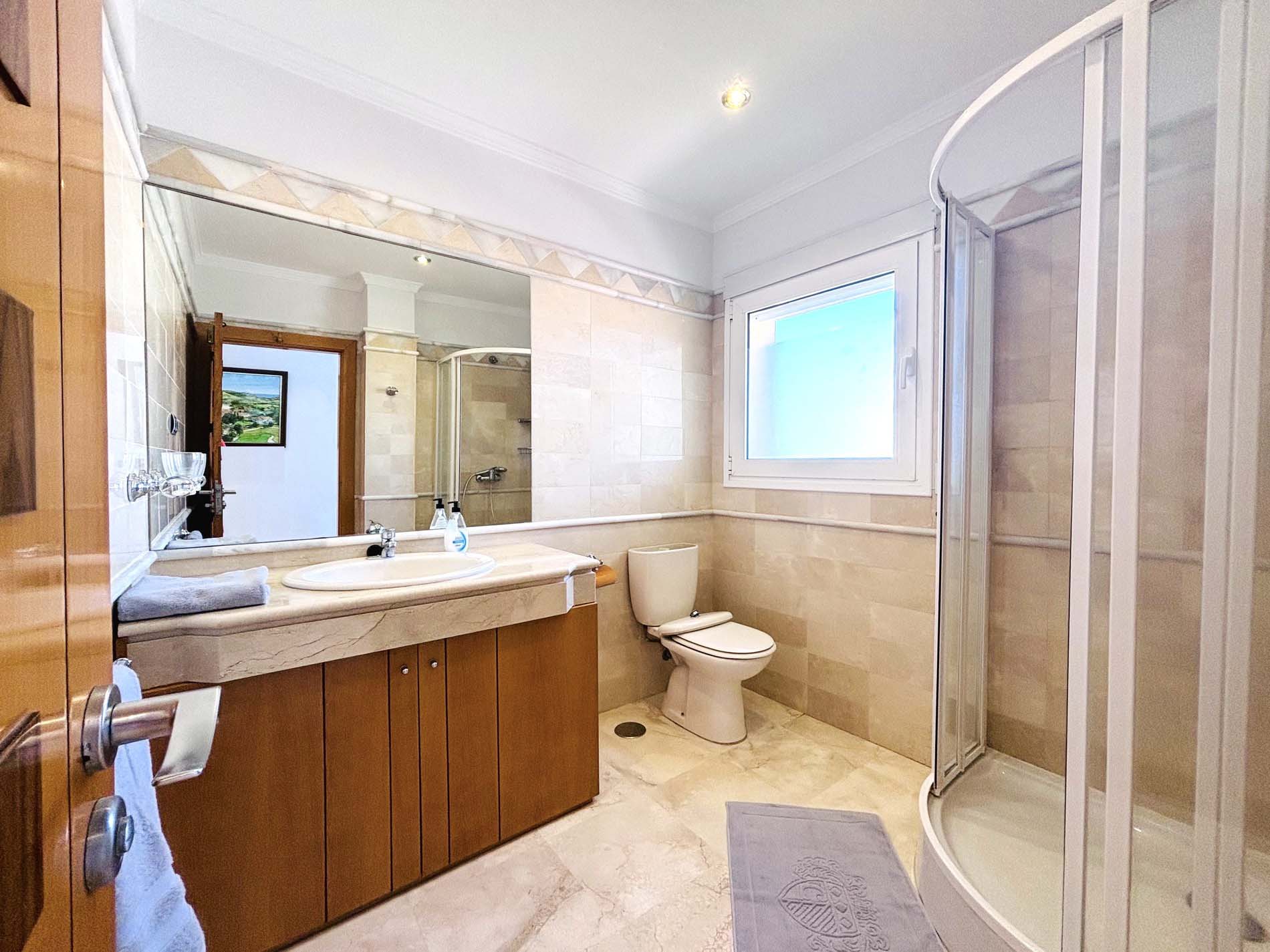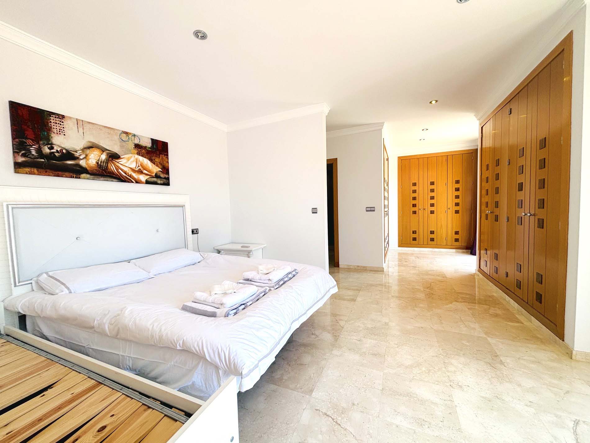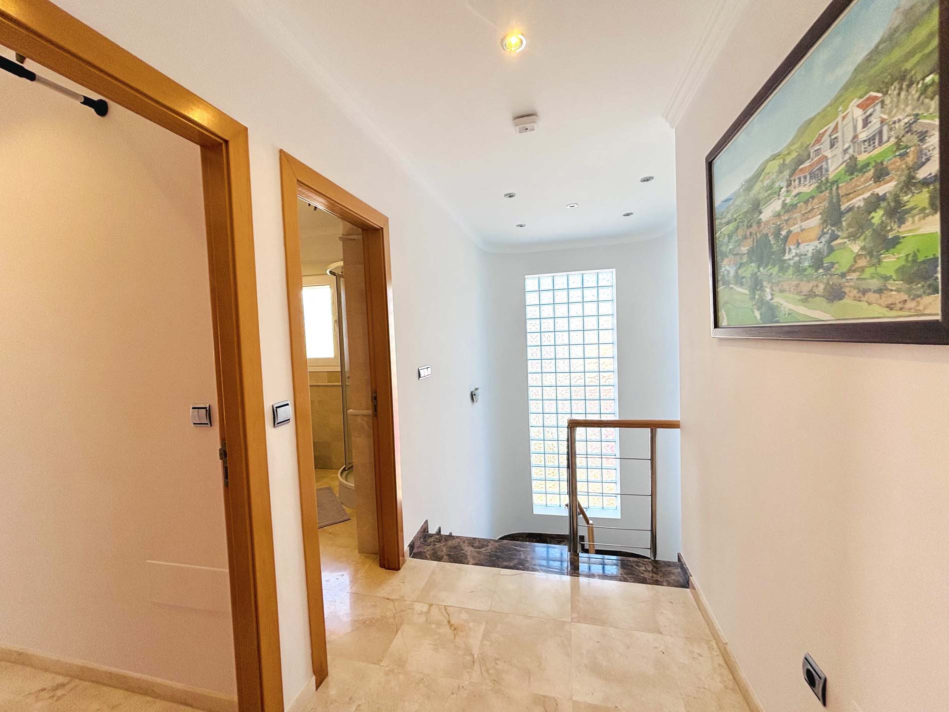 En el primer piso, el dormitorio principal es realmente grande, tiene muchos armarios, un gran baño en suite con ducha y jacuzzi y una enorme terraza con bonitas vistas al mar. Junto a ella se encuentra el tercer dormitorio con su terraza privada y el tercer baño con ducha. En la planta baja, el garaje tiene capacidad para 2 coches grandes y espacio para almacenaje. También hay 3 plazas de aparcamiento más en el callejón interior de la propiedad.