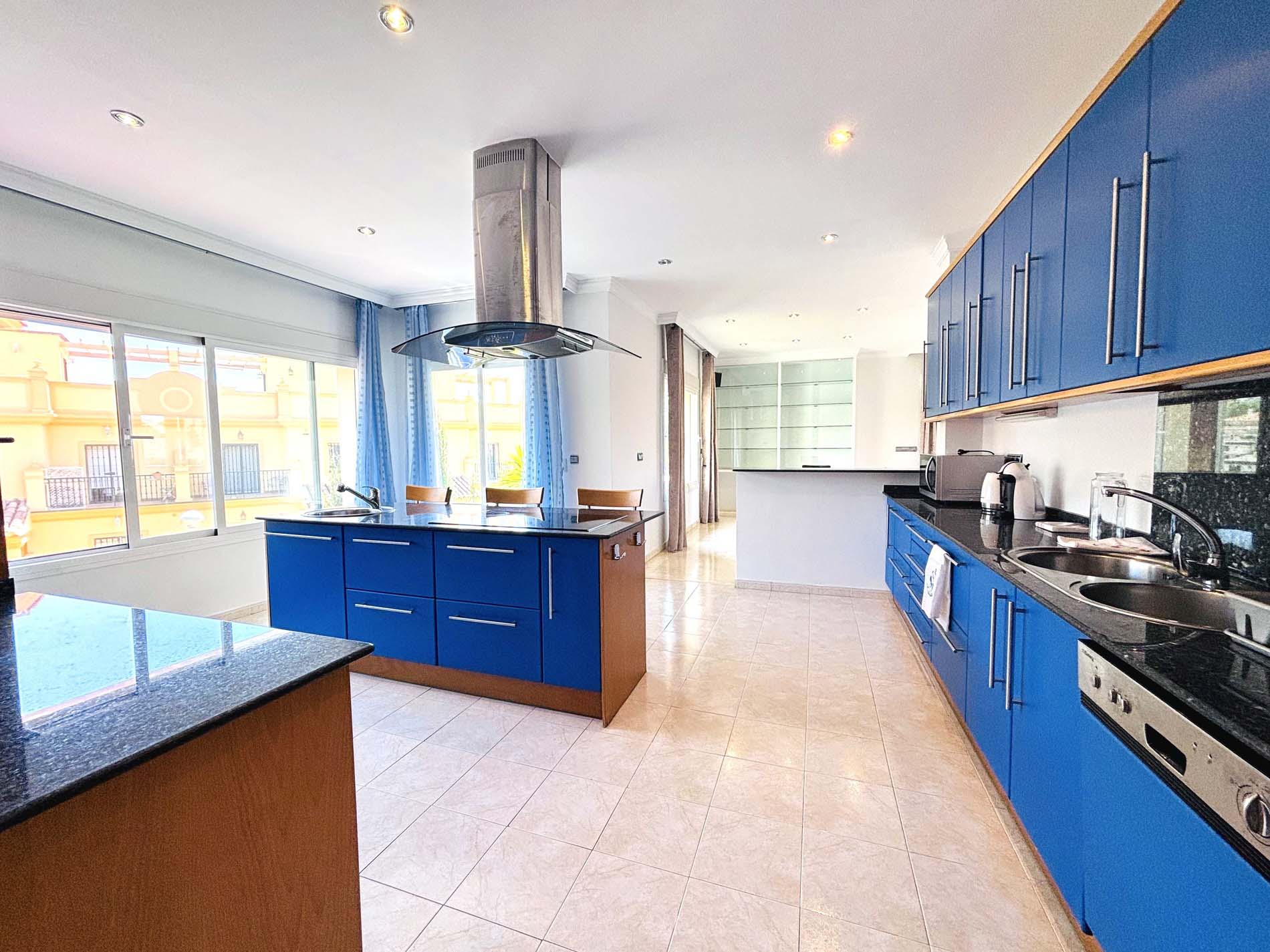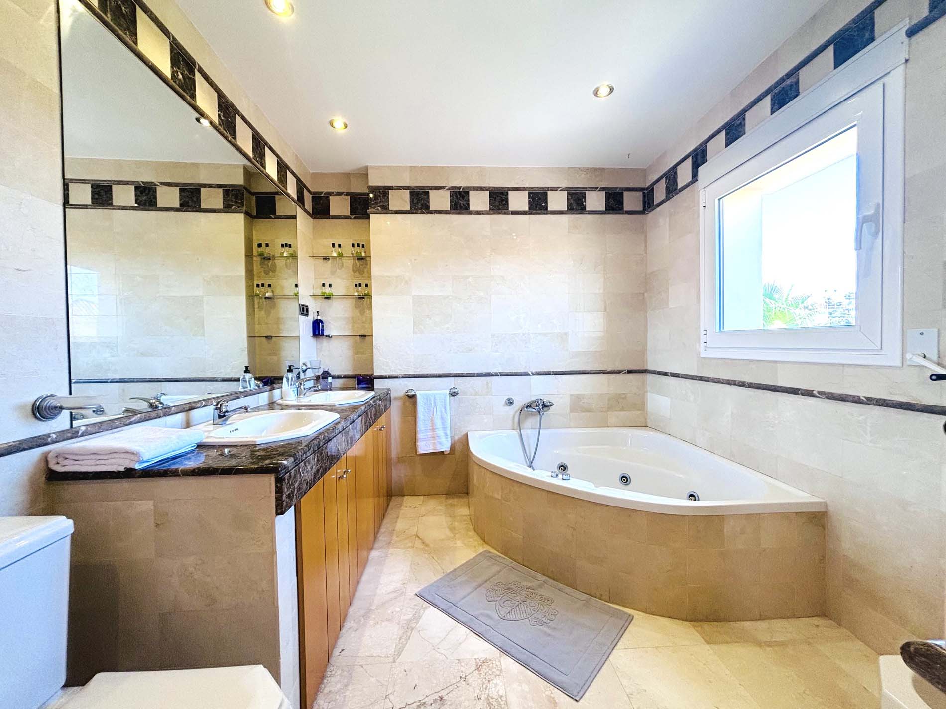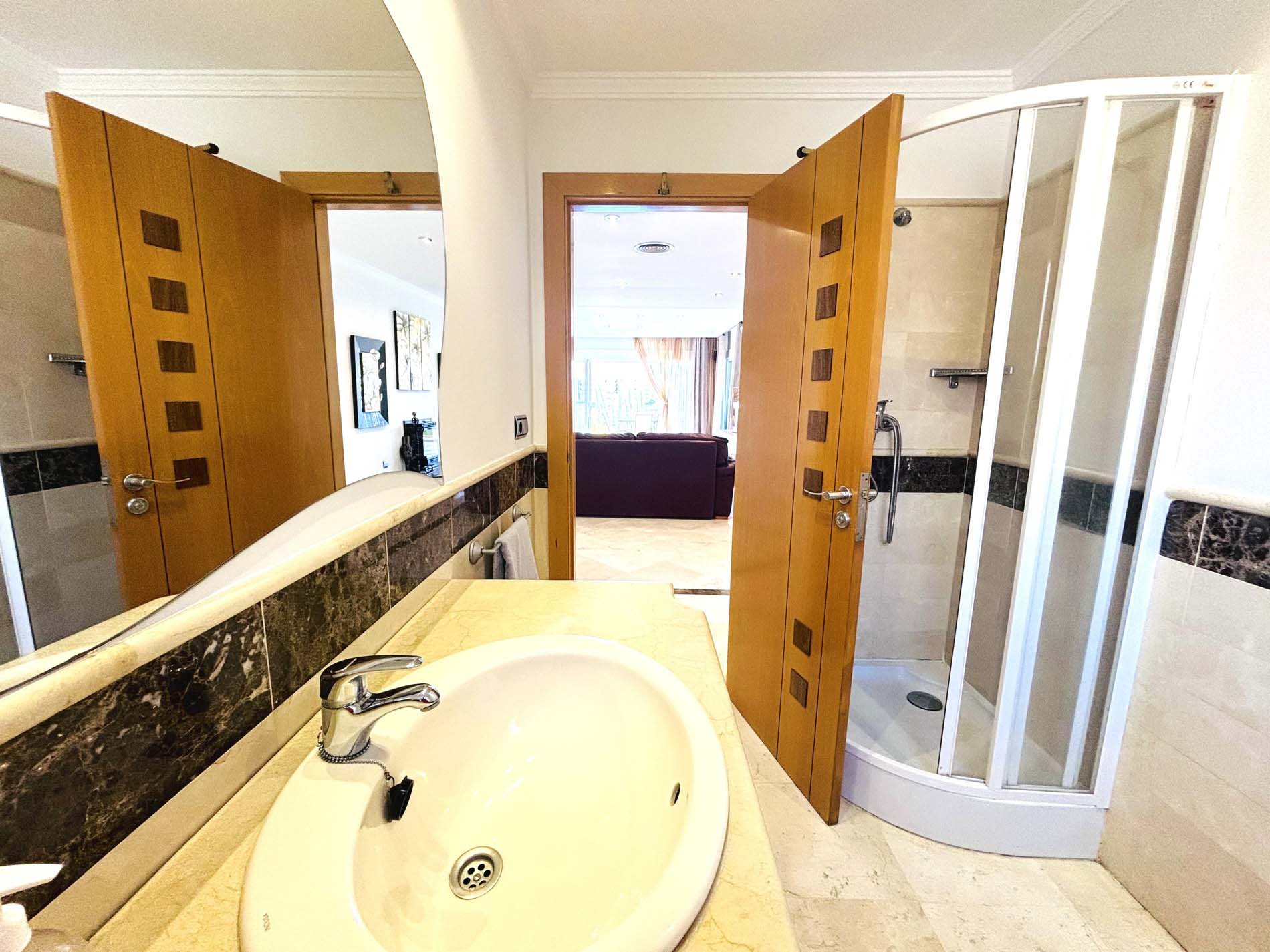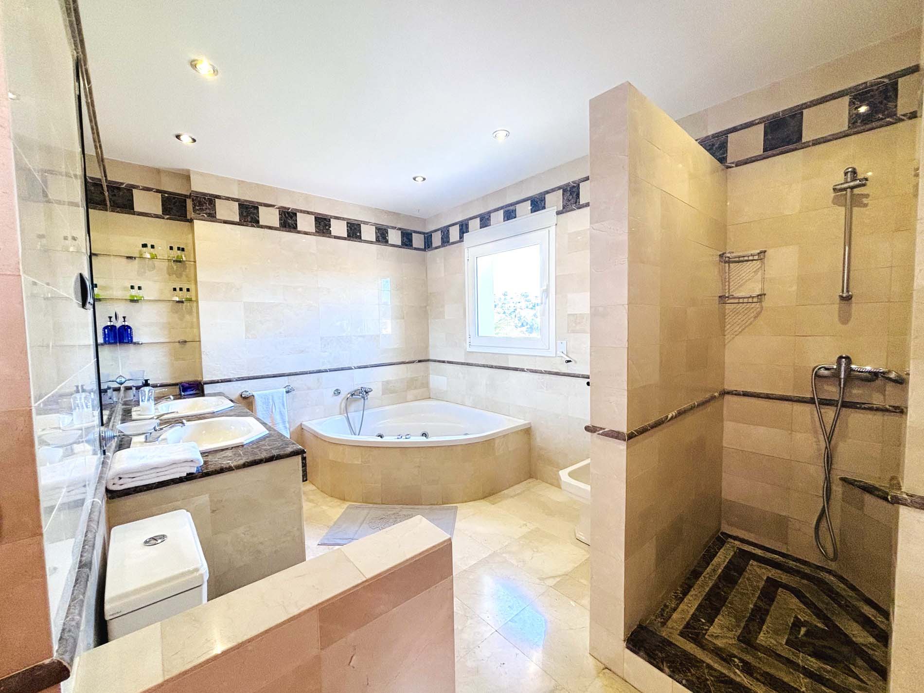 En el primer piso, el dormitorio principal es realmente grande, tiene muchos armarios, un gran baño en suite con ducha y jacuzzi y una enorme terraza con bonitas vistas al mar. Junto a ella se encuentra el tercer dormitorio con su terraza privada y el tercer baño con ducha. En la planta baja, el garaje tiene capacidad para 2 coches grandes y espacio para almacenaje. También hay 3 plazas de aparcamiento más en el callejón interior de la propiedad.